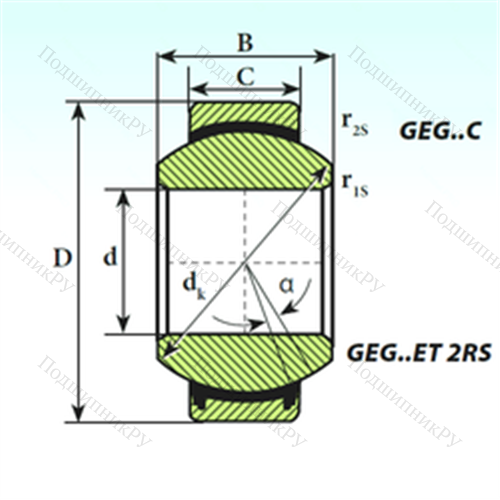 Подшипник скольжения сферический GEG 25 C конструкция которого представлена внешним кольцом, внутри вращается внутренняя обойма. Существуют прямые, шарнирные (самовыравнивающиеся), угловые, гидравлические, двойные шарикоподшипниковые и роликоподшипниковые варианты исполнения. Отдельные разновидности изделий (с парой трения «сталь – сталь») нуждаются в обслуживании и имеют каналы для подачи смазки, в то время как другие не нуждаются в ТО. В первом случает система включает в себя пару стальных шин, обработанную предварительно фосфатами и дисульфитом молибдена. Необслуживаемые модели покрываются политетрафторэтиленом, армируются медью и дополнительно усиливаются хромом.